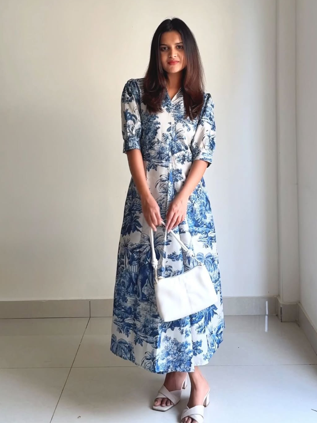 This easy breezy dress comes with pleats along the frontline which gives this dress an A-Line look, making it super comfortable to carry. It is a must have for your vacations or lunch as a classic beige canvas adorned with intricate blue toile-inspired patterns is perfect for a refined yet relaxed look . The comfortable silhouette is flattering yet convenient. Made from smooth, wrinkle resistant fabric. Its quick drying fabric helps avoid sweat patches. The premium linen fabric used to craft this dress ensures easy breathability and comfort.