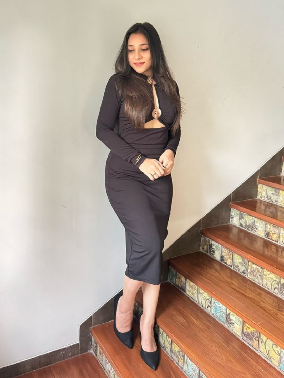 The Stretchable Ribbed Bodycon Hardware cut-out dress is made from soft stretchable ribbed fabric. The silhouette of the dress flatters every curve, and the hardware cut-out detailing is a fun addition, adding oomph to this dress.  The fabric ensures that no underwear lines will show in this dress, making it easy to wear.
