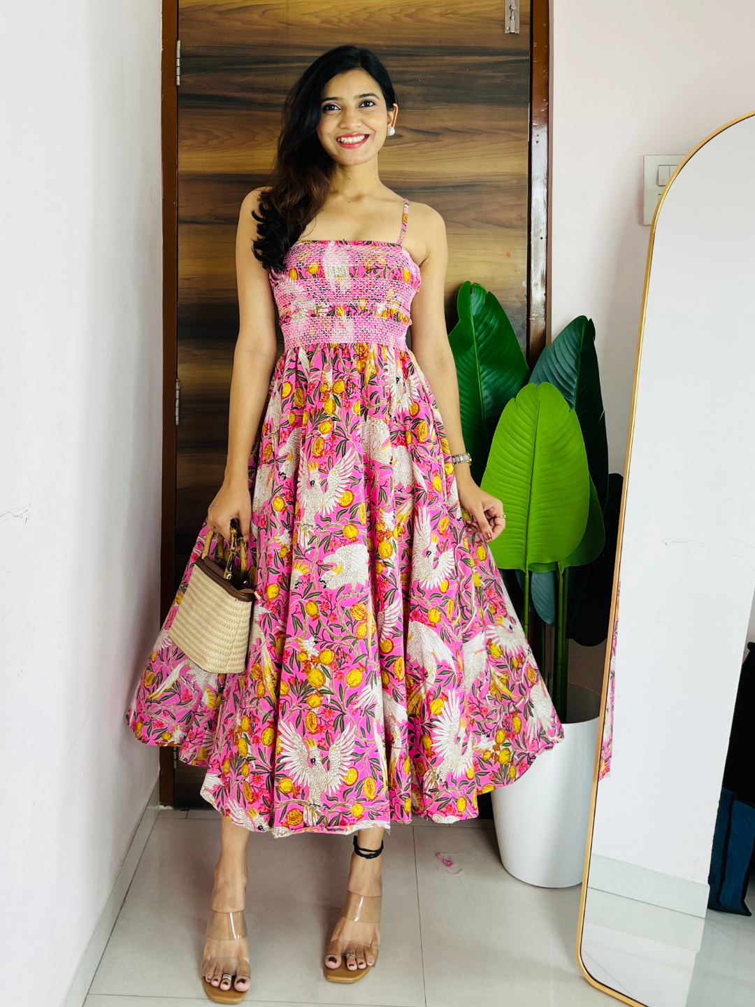 Smocked Strappy Cotton Midi Dress - Uptownie
