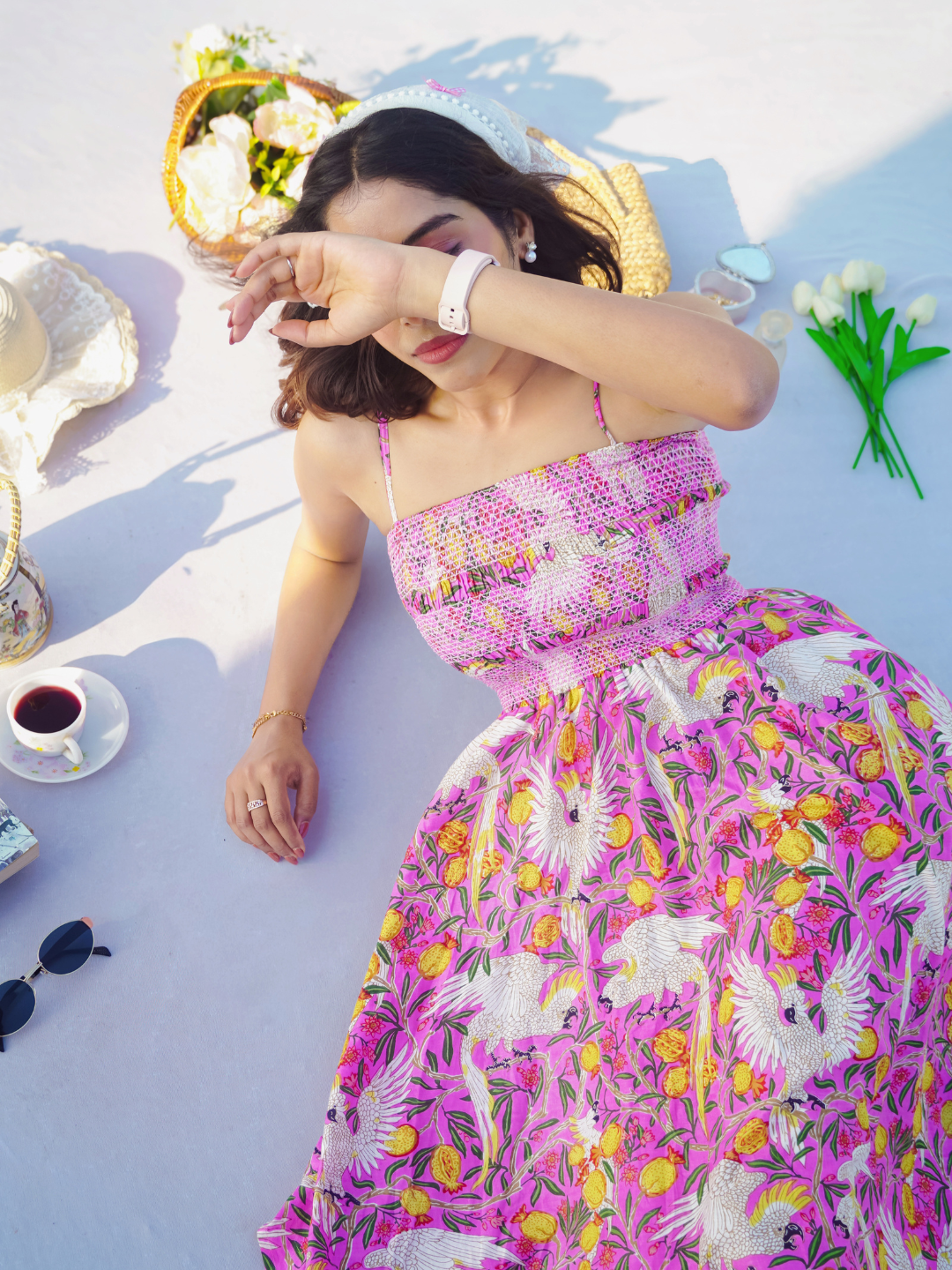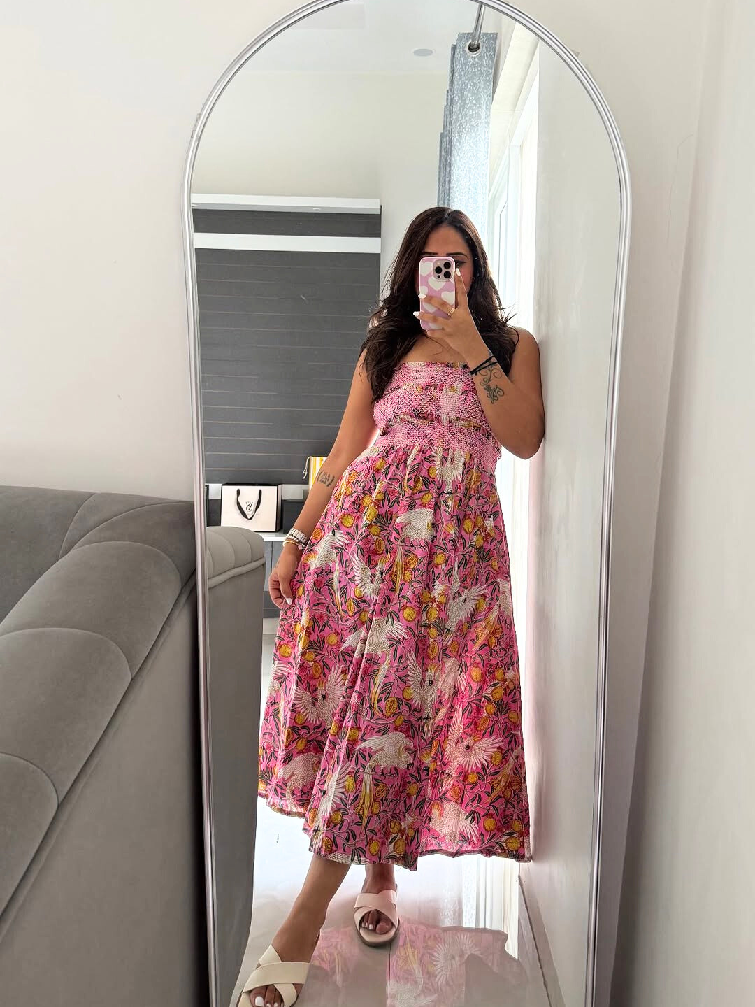 Easygoing, breathable, and totally adorable—the Smocked Strappy Cotton Midi Dress is your warm-weather BFF. Made from soft cotton with a comfy smocked bodice and delicate adjustable straps, it’s designed to move with you while keeping things light and breezy. The midi length gives it that sweet spot between casual and elevated, making it perfect for park hangs, picnics, or just vibing through summer days. Throw on some chunky sandals or cute sneakers and you’re good to go.