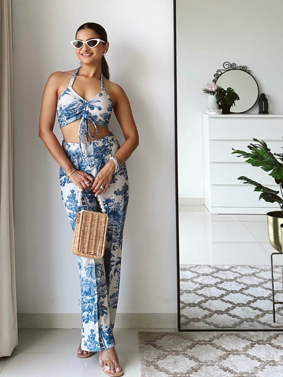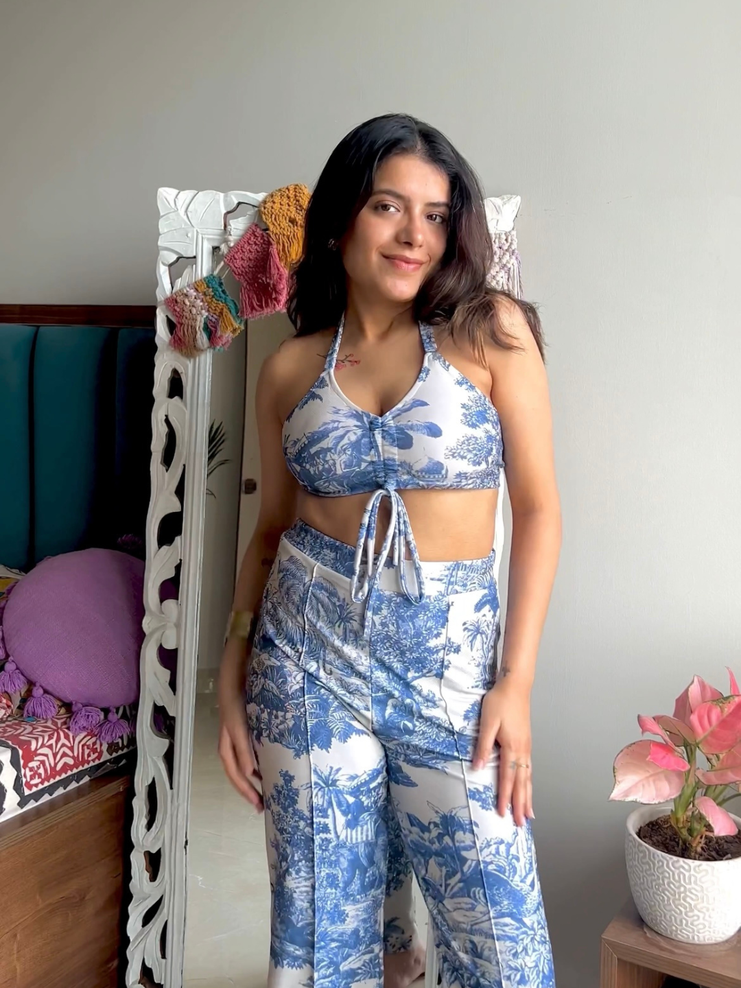 Elevate your style with this stunning halter neck co-ord set, featuring a sleek front tie-up detail that adds a touch of sophistication. Perfect for both casual outings and special occasions, this ensemble effortlessly combines fashion and flair for a standout look. The premium fabric is wrinkle-free, colour bleeding resistant and machine washable thereby making it long lasting and easy to maintain.