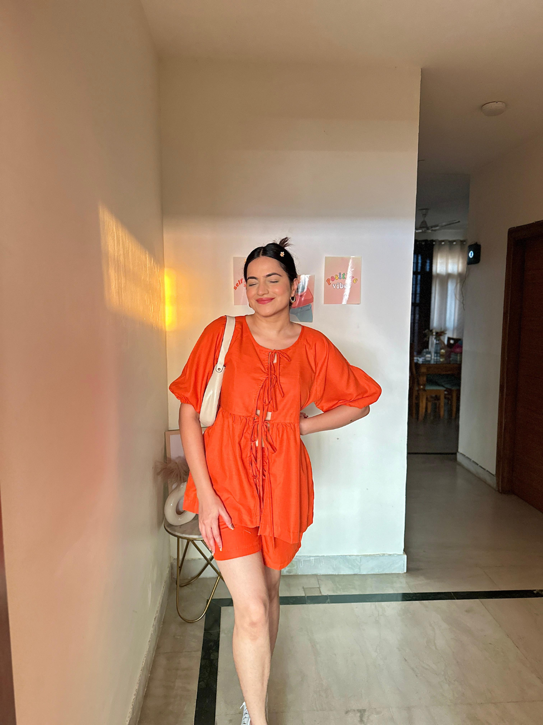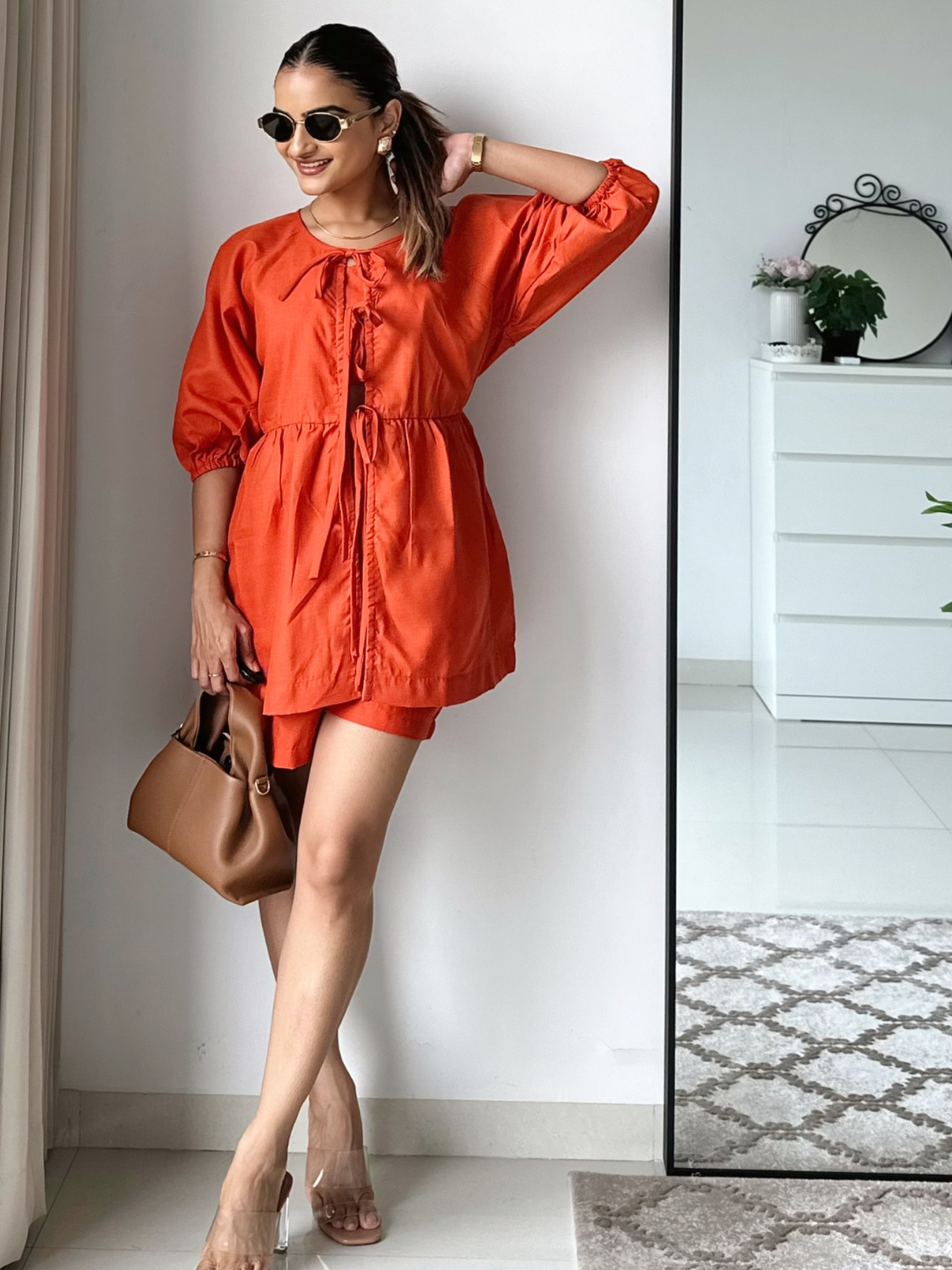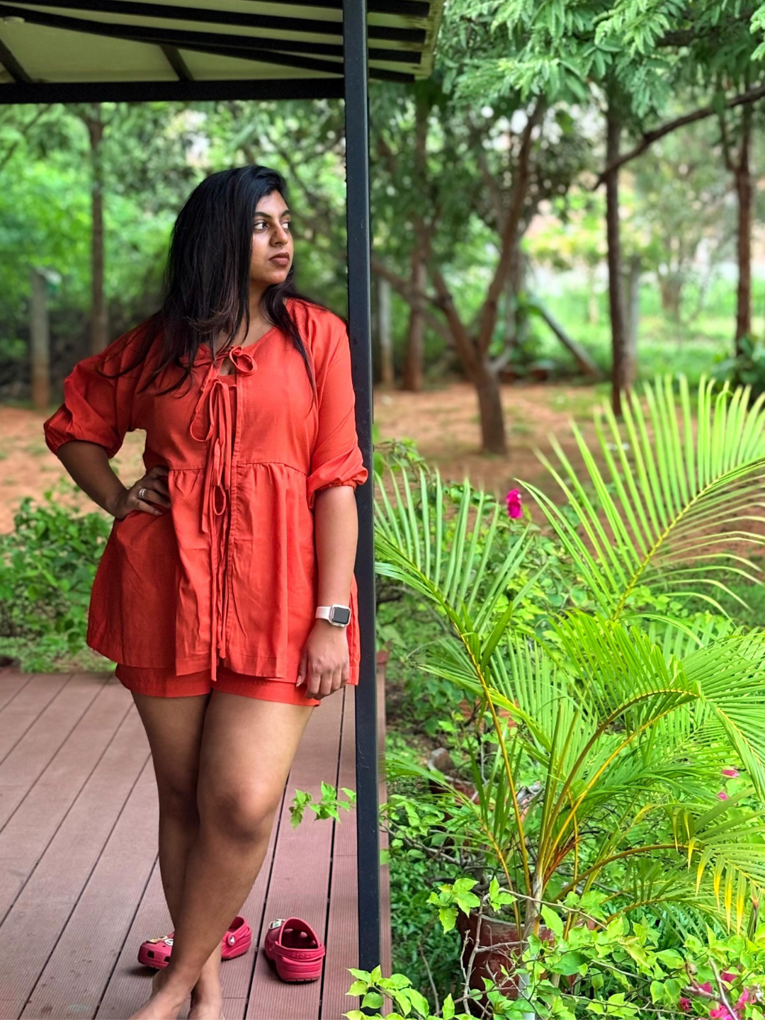 Level up your everyday looks with the Linen Three Piece Shorts, Shirt, and Crop Top Set! The set features shorts, an open peplum shirt with bows and tie-up detailing and an inner crop top with back smocking. The shorts have a super soft all-around elastic for the perfect fit. This set is the complete package, and will make you look like a complete package, on your travels, at the airport, at the movies, or for a fun lunch!  The premium fabric is wrinkle-free and colour bleeding resistant and machine washable thereby making it long lasting and easy to maintain.