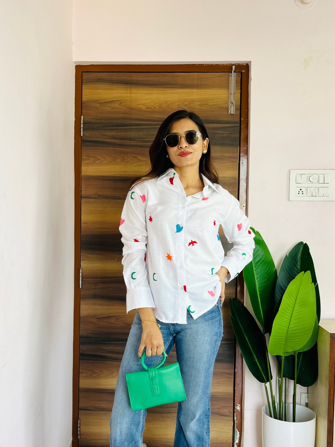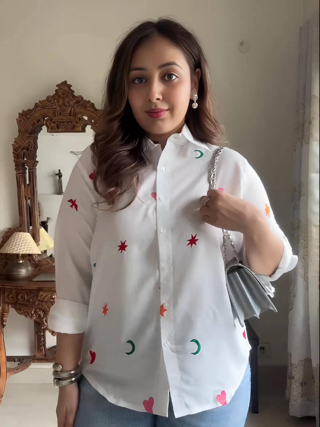 Give your everyday look a stylish upgrade with this all-over embroidered shirt. Delicate thread work is scattered across the fabric, adding just the right touch of detail without going over the top. Whether you're heading to brunch, a casual outing, or just want to feel a little more dressed up, this shirt fits right in. Soft, breathable, and effortlessly chic – it’s one of those pieces that looks great with everything, from jeans to skirts.