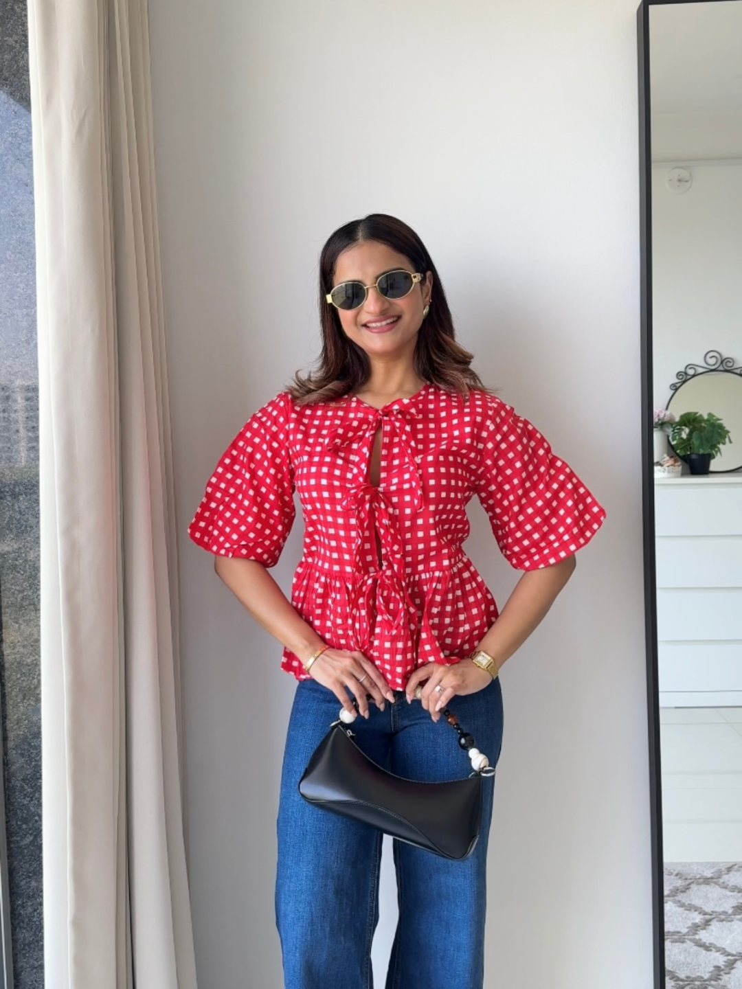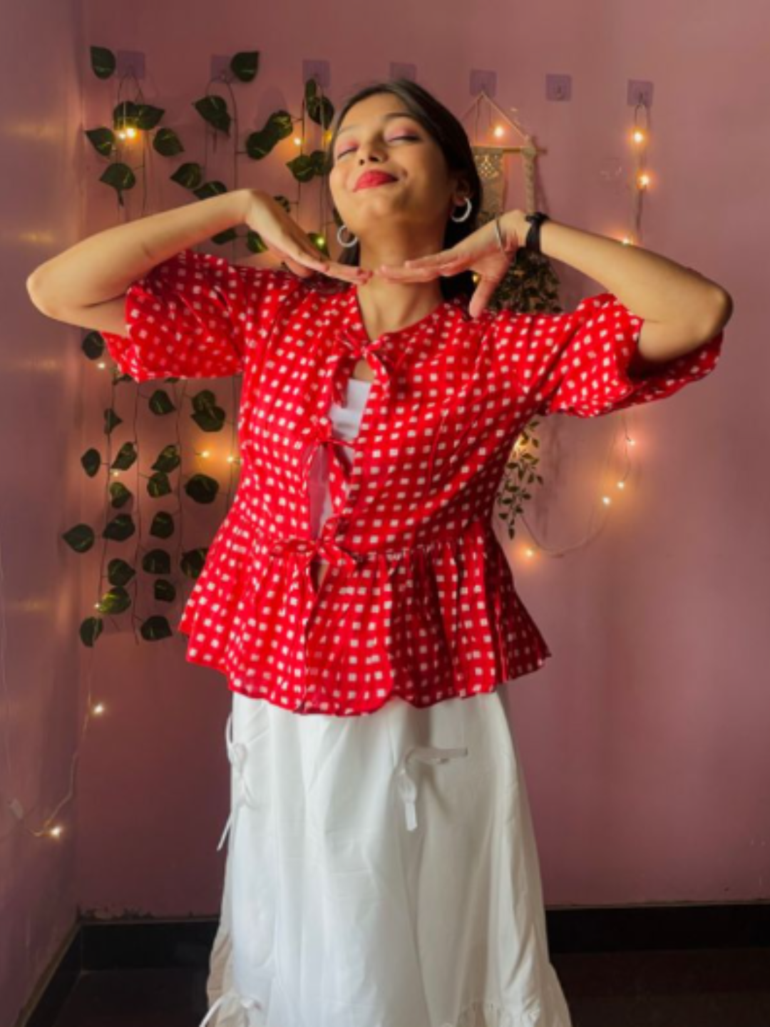 Level up your everyday looks with the Bow peplum top with puff sleeves! The top features an open peplum shirt with bows and tie-up detailing. It is the trendiest, most pinterest-y top ever and is the perfect accompaniment to your blue jeans for a look that's cute, girly and oh so instagrammable.  The premium fabric is wrinkle-free and colour bleeding resistant and machine washable thereby making it long lasting and easy to maintain.