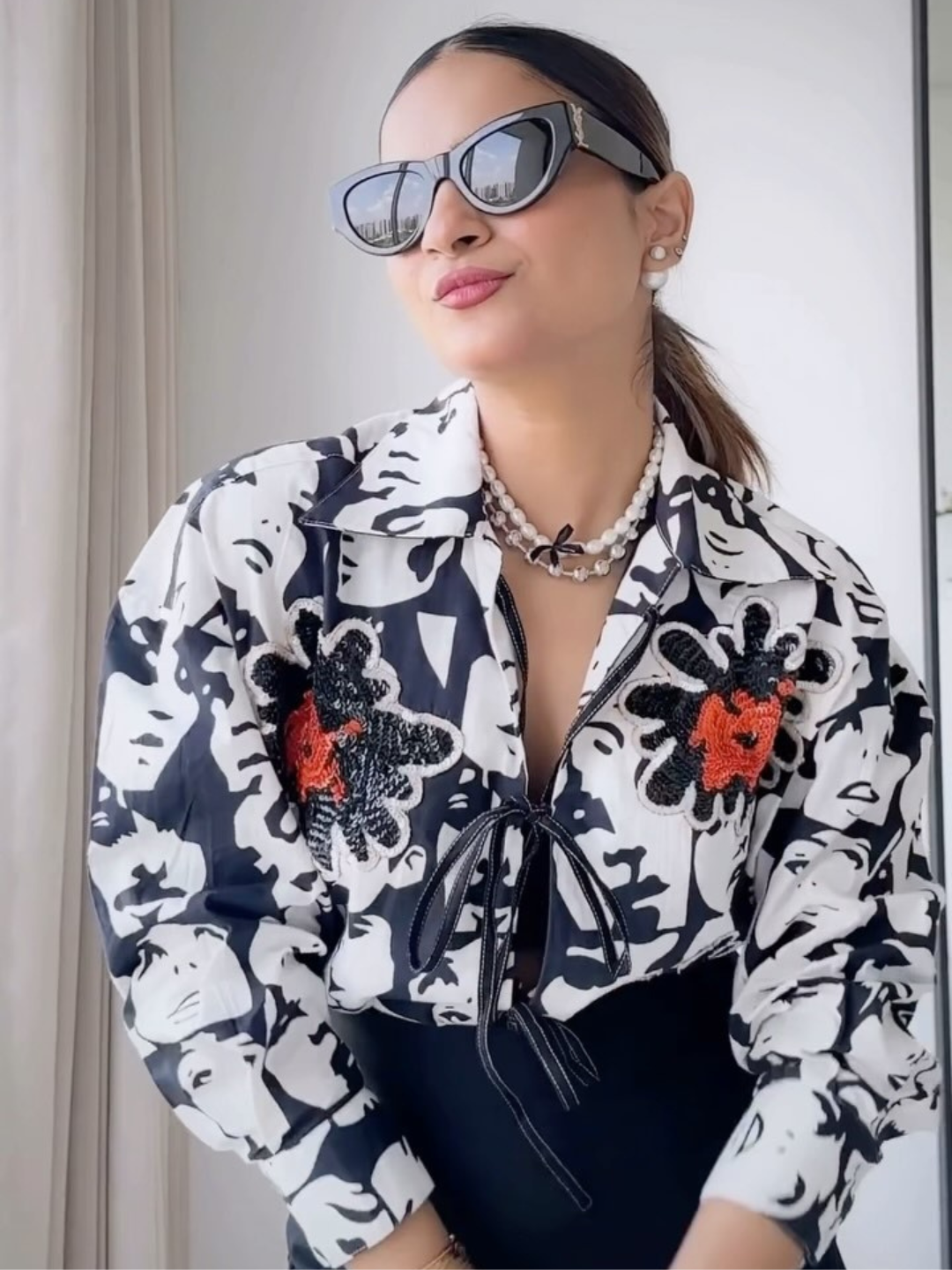 This Printed Tie-Up Cotton Sequinned Shirt is a versatile wardrobe must have! Wear it on top of a plain shorts, or your favourite blue jeans, or with well tailored pants for a polished look! The black tie ups with white topstitching elevate this shirt, making it the perfect brunch look. The sequinned patches add a touch of glamour to this shirt, making it ready for a party as well.