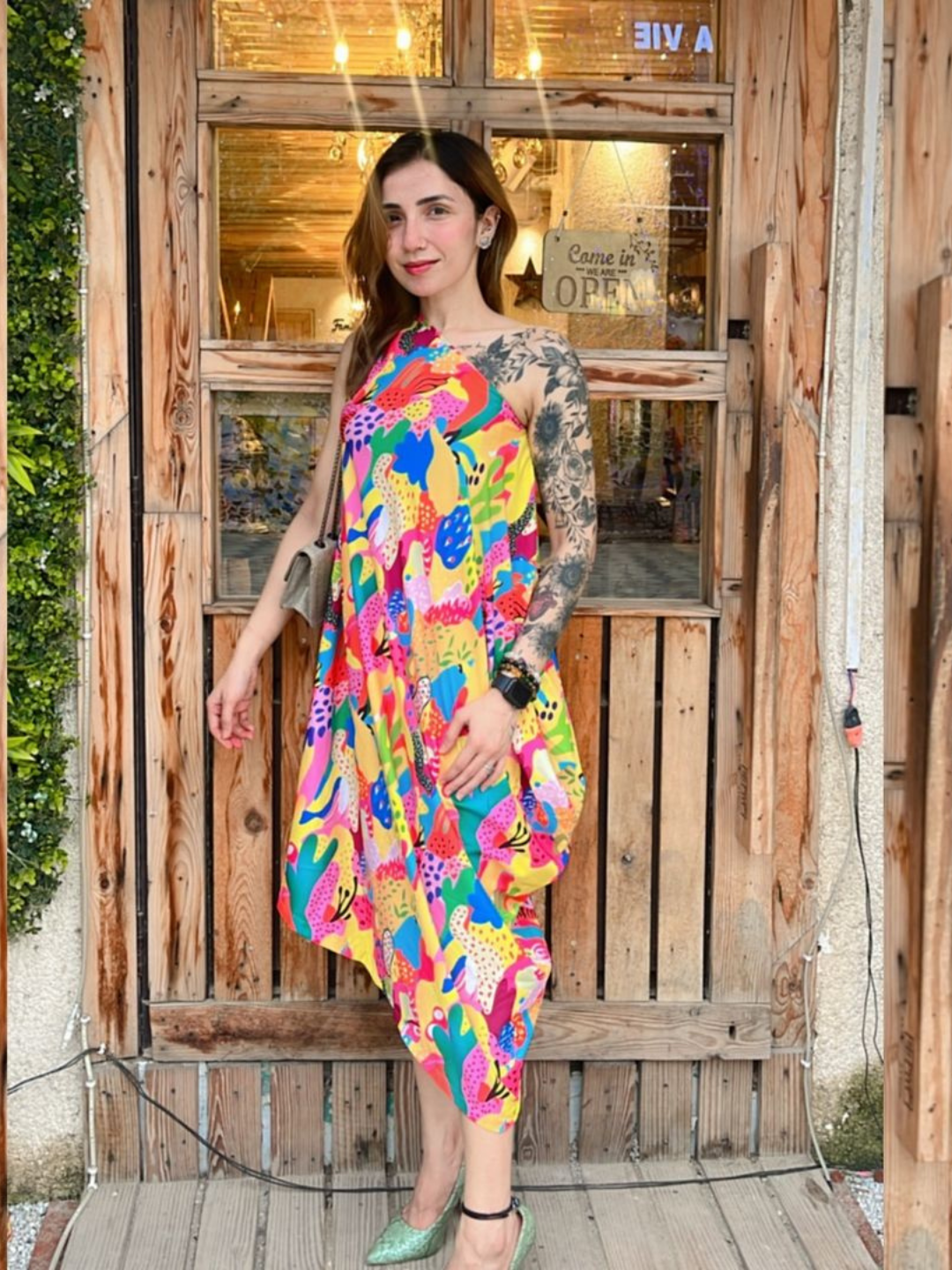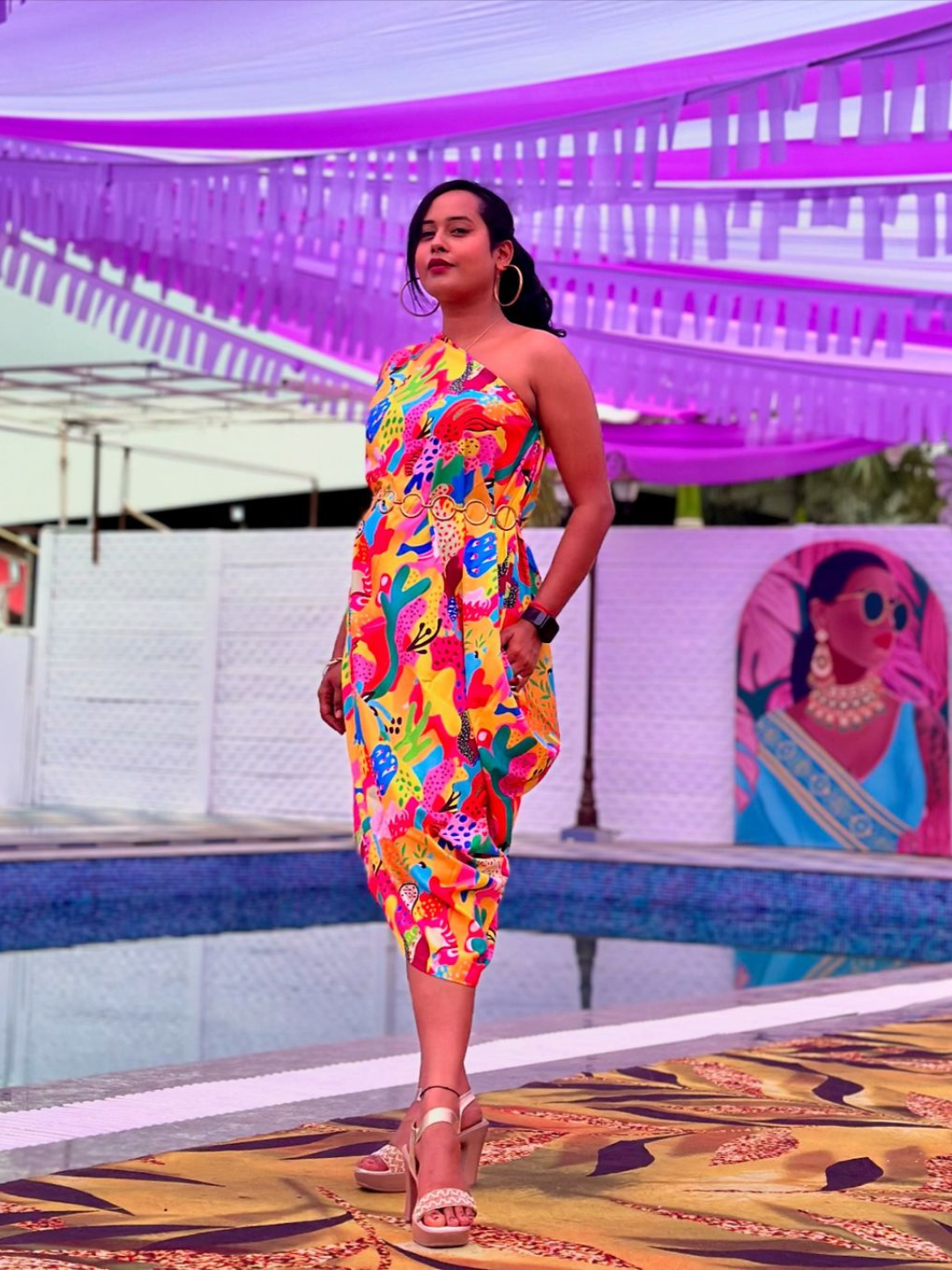 The dress is made from soft crepe fabric. The silhouette of the dress flatters every curve, and the One-Shoulder and Drape style detailing is a fun and risky addition, adding oomph to this dress.  The fabric ensures that no underwear lines will show in this dress, making it easy to wear. The dress features a one-shoulder detailing - making this a perfect dress for a party.