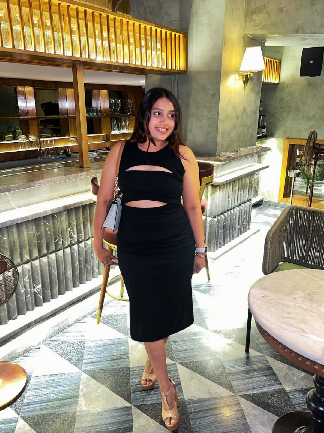 The Stretchable Ribbed Boydcon Bandage dress is made from soft stretchable ribbed fabric. The silhouette of the dress flatters every curve, and the cut-outs are a fun and risky addition, adding oomph to this dress.  The fabric ensures that no underwear lines will show in this dress, making it easy to wear. The dress features two cut-outs in the front, and one in the back - making this a perfect dress for a party. Move over LBD, the MBD(Midi Black Dress) is what it's all about!