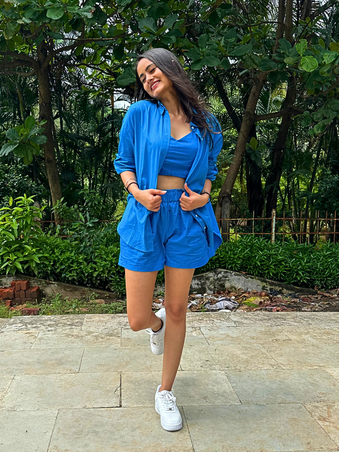 Level up your everyday looks with the Cotton Shorts, Shirt and crop top set! The set features  shorts, an open collared shirt with buttons and an inner crop top with back smocking. The shorts have a super soft all around elastic for the perfect fit. This set is the complete package, and will make you look like a complete package, on your travels, at the airport, at the movies, or for a fun lunch!  The premium fabric is wrinkle-free and colour bleeding resistant and machine washable thereby making it long lasting and easy to maintain.