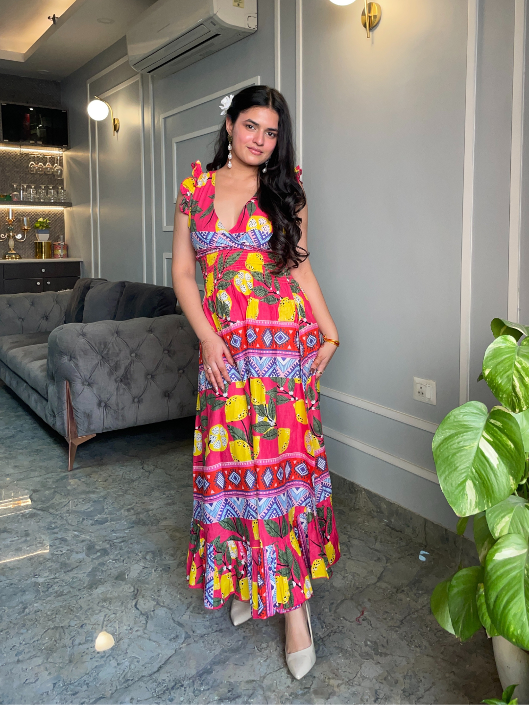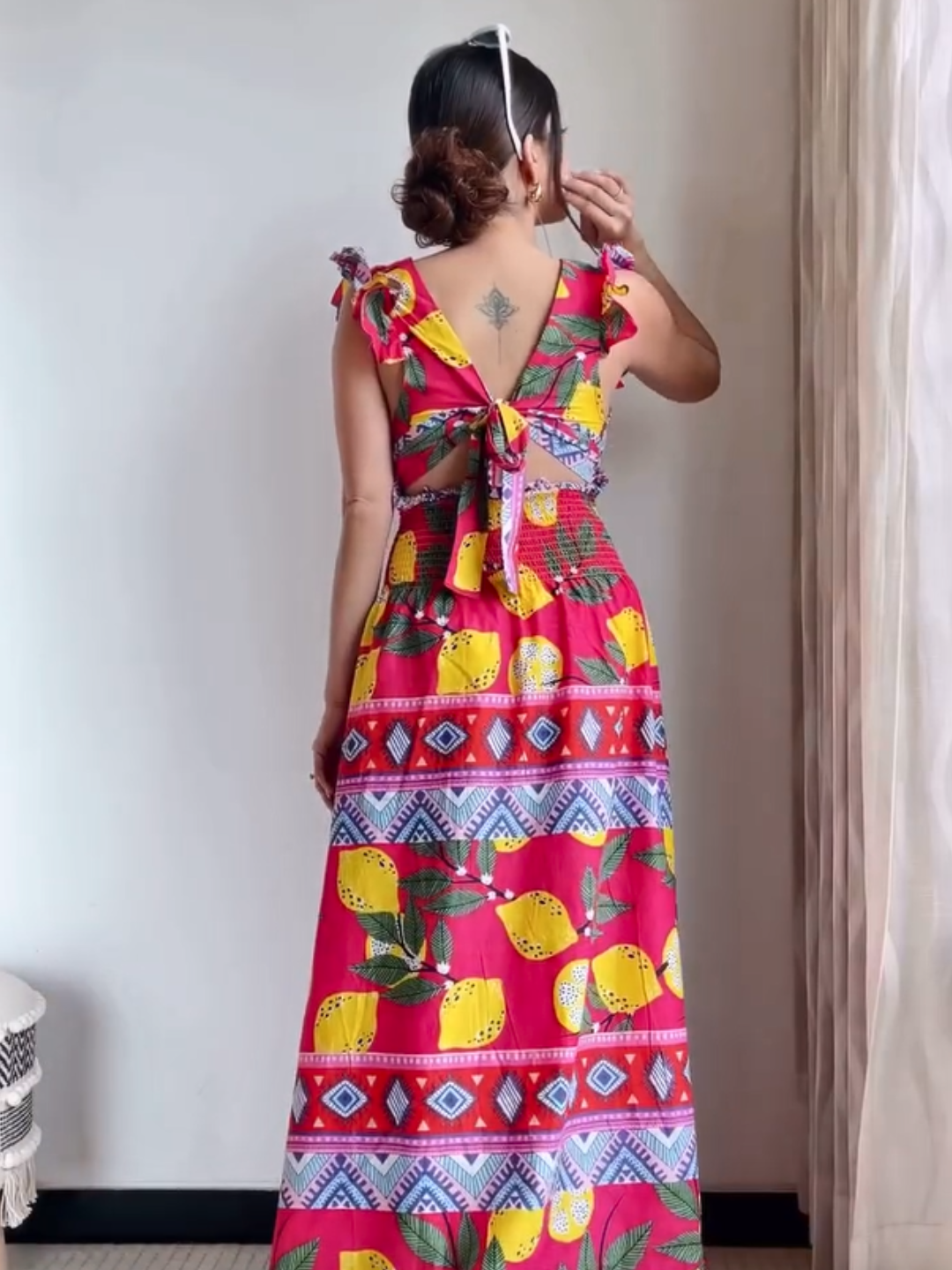 The Printed Cotton V-Neck Back tie-up Midi Dress is made from soft cotton fabric. The relaxed silhouette is perfect for hot summer days, and gives the perfect soft-girl feminine vibe! It's the perfect vacation outfit - wear it with white sneakers or your favorite flats for a look that will make heads turn. You'll be so comfortable and so pretty in this dress, you'll never want to take it off! The cute print and the tie-up detailing makes this your go to outfit for every outing. The cutout detail at the back adds a touch of fun to a classic cut.