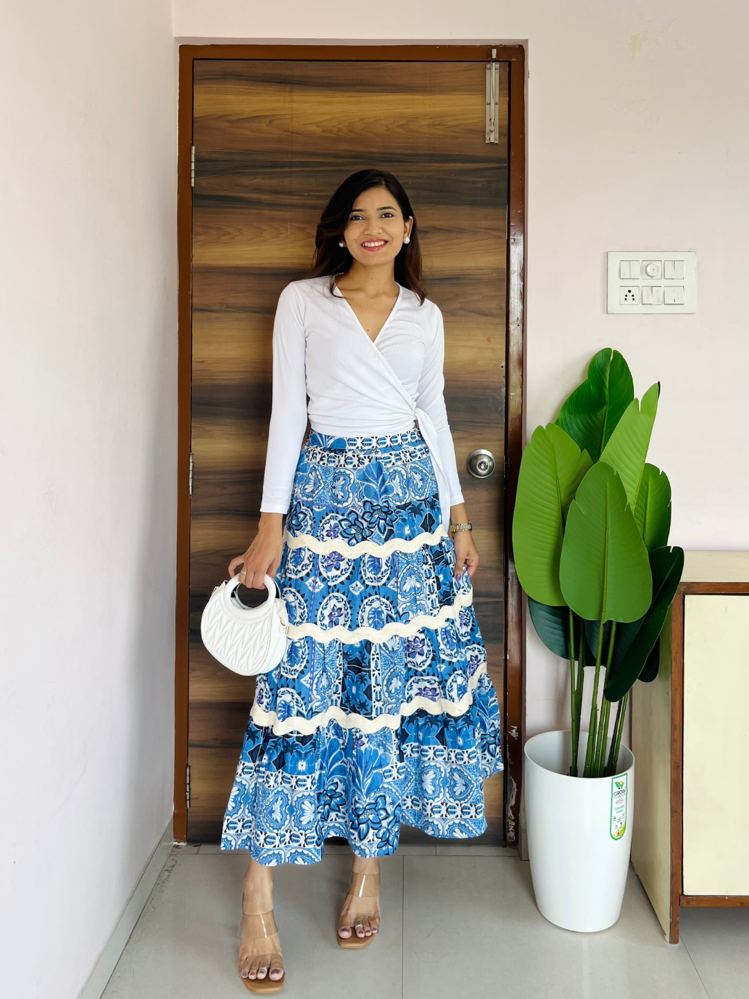 Elevate your wardrobe with our Ric-Rac Tiered Maxi Skirt, a perfect blend of comfort and style. This stunning skirt features a playful blue tile patterns, bringing a touch of classic charm to your ensemble. The tiered design adds a flirty flair, allowing for effortless movement and a beautiful silhouette. Crafted from lightweight, breathable fabric, it’s ideal for warm days and cool evenings alike. Pair it with a simple tee or a chic blouse for a versatile look, whether you’re heading to brunch or enjoying a leisurely stroll. Embrace timeless elegance with a modern twist in this must-have maxi skirt!